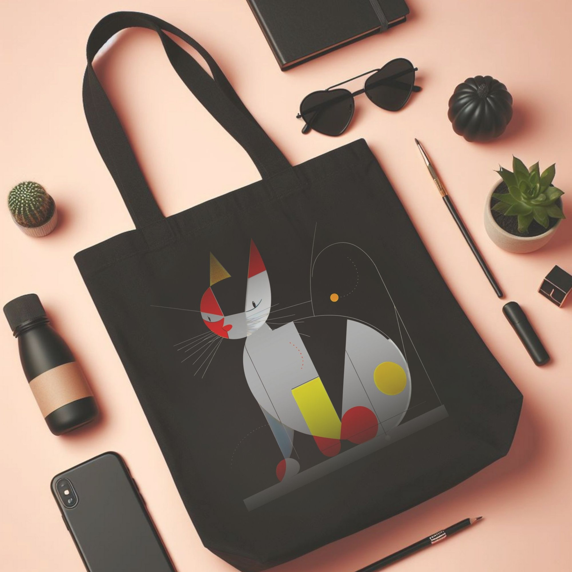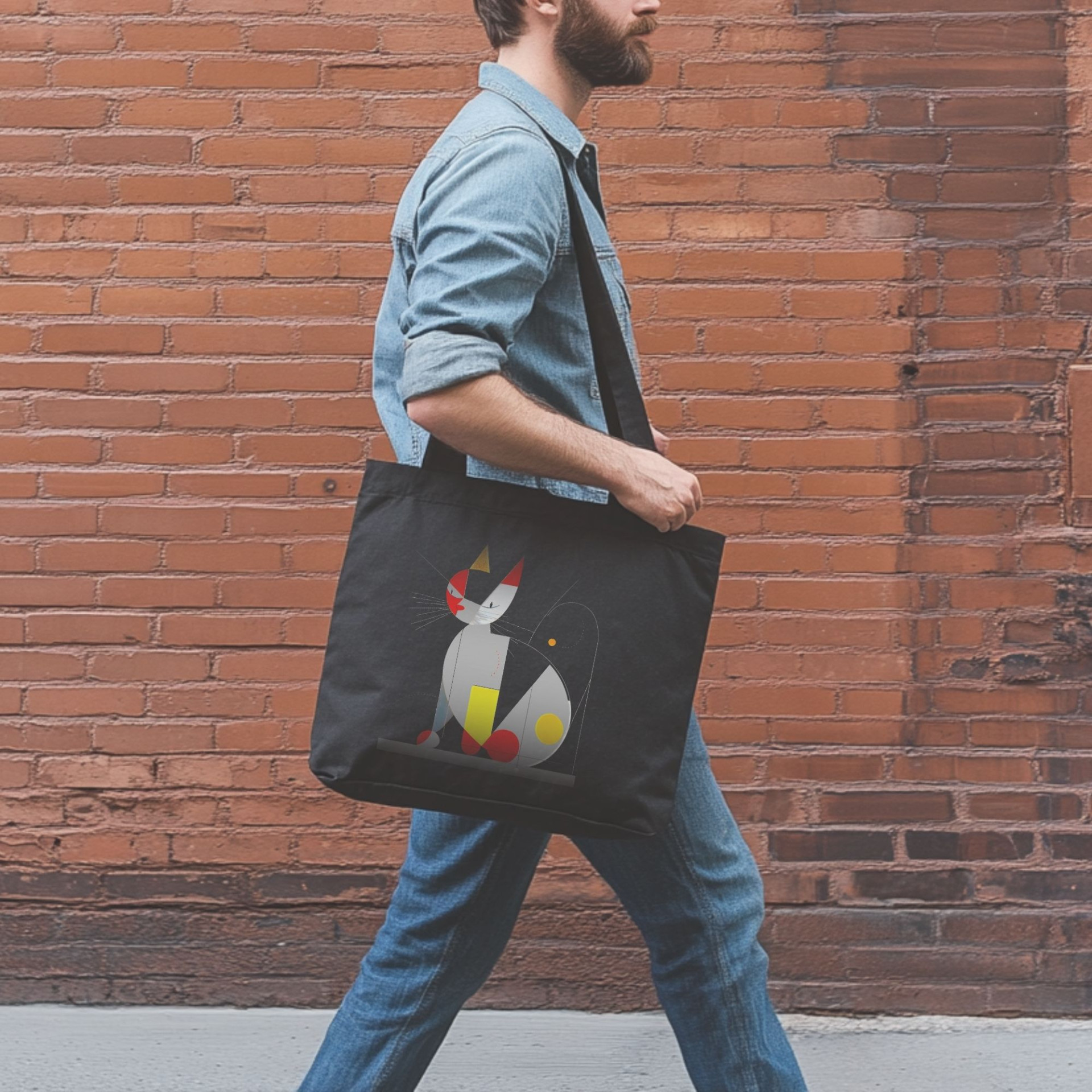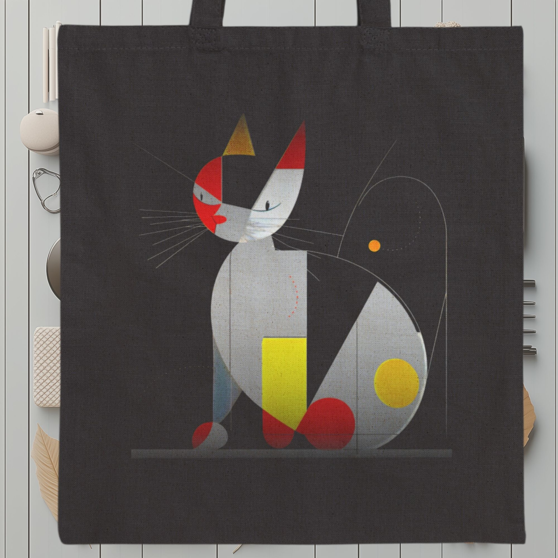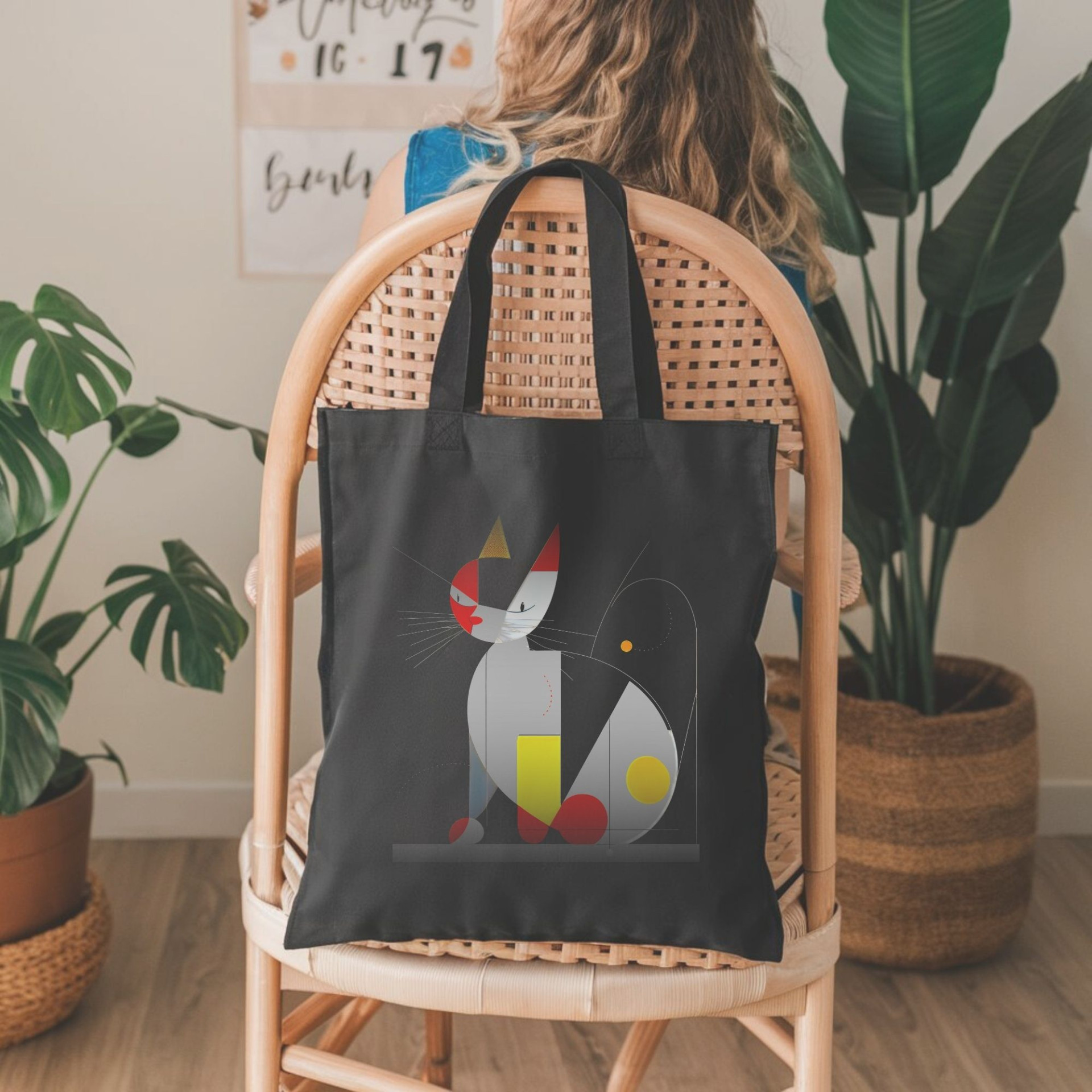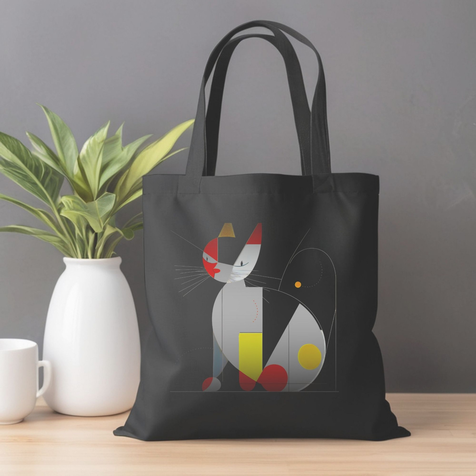 This black tote bag features a unique geometric cat design with a modern art aesthetic. Bold shapes in hues of red, yellow, and gray come together to form a stylized cat, adding an artistic flair to any outfit. This abstract interpretation captures the elegance and curiosity of cats, perfect for those who love both felines and contemporary design.