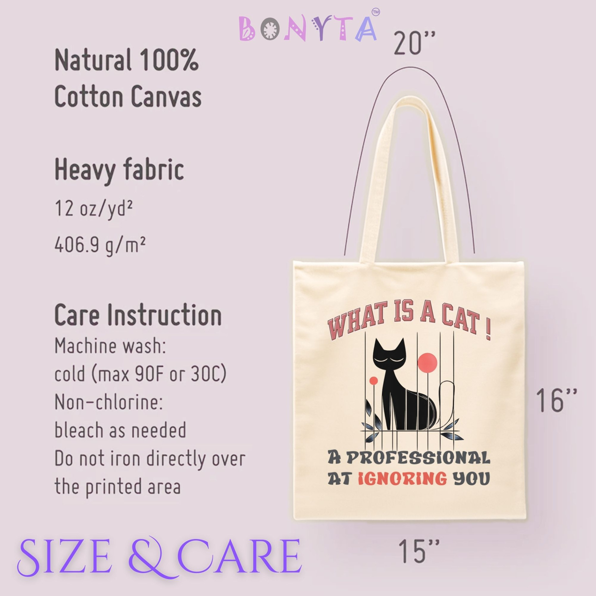 At BONYTA.Online, we celebrate the unique personalities of our beloved cats. This tote connects you with a community of cat lovers who understand the charm of their pets’ aloofness, bringing a bit of joy to your daily routine.